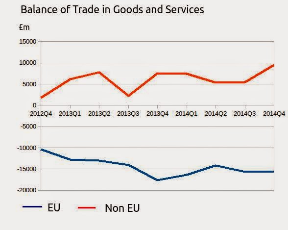 Something odd is going on here, it is almost as if the UK is being positively disadvantaged by being in the EU. If this is the case then we should see imports from the EU into the UK growing much faster than UK exports to the EU. If being inside the EU is positively damaging the UK we should see an accelerating deficit in trade with the EU compared with trade with other countries.