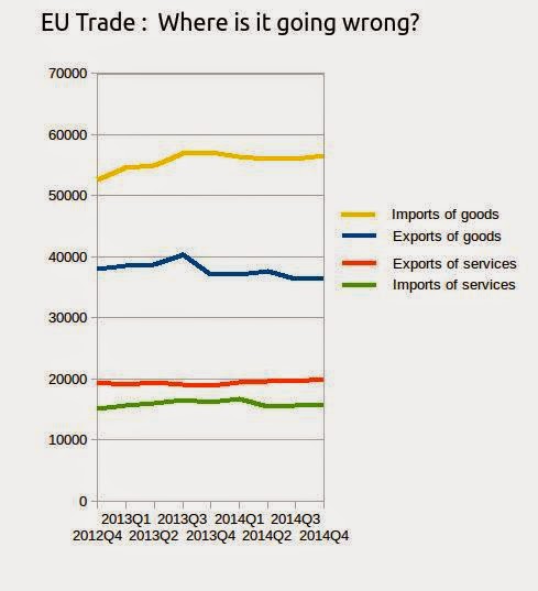 A Quarterly Trade deficit of over £15,000 million pounds with the EU is a deficit of crisis proportions. The full balance of payments deficit with the EU is even worse, at about £100 billion last year (See Membership of the EU: Pros and Cons). On closer analysis it is the growing deficit in sales of goods and the almost flatlining of service sales to the EU that are causing this large deficit.