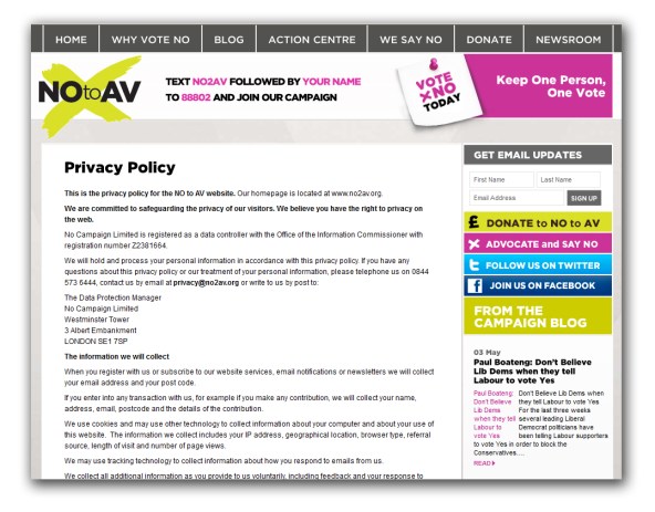 The AV referendum appears to have been acting as a dry run. During the campaign we can see the Action Centre section of the now defunct website (via Wayback Machine), where widgets could be added to blogs, Facebook and websites. Supportive tweets could be sent directly via the website and donations could be made which required names and addresses. All this information helping to build a database of supporters. Is it a coincidence that subsequently Metis began life in 2013 covering already 500,000 people?
