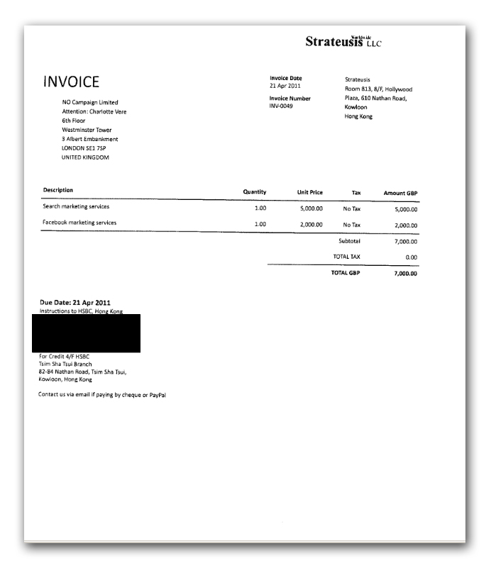 That NotoAV did begins to make more sense when we consider that Strateusis submitted a number of invoices to the AV campaign including this one below for £7,000 providing Search and Facebook marketing services: