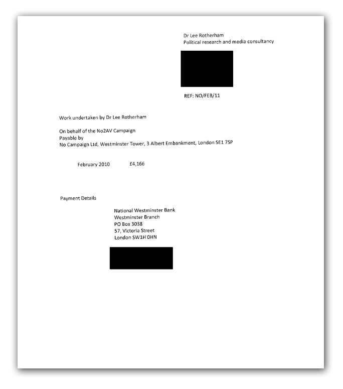 Further invoices show yet another close associate of Elliott working for him in the AV Referendum campaign. We see that Dr Lee Rotherham was paid £4,166 (below), for “work undertaken”. Rotherham advises The Taxpayers’ Alliance on EU matters and has written at least two books with Matthew Elliott.