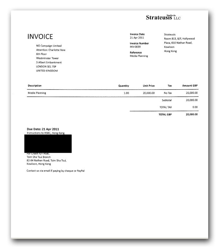 In addition to the £65,000 paid to Message Space (including one invoice for £17,000) Singh then went on to pay Strateusis well over £30,000, a Hong Kong company which he is a director. One such invoice, (below) showed a considerable sum of £20,000 for the vague term of “media planning”. Interesting using the Hong Kong company meant he paid no tax on the money. Invoices for Message Space and Strateusis combined amounted to nearly £100,000.