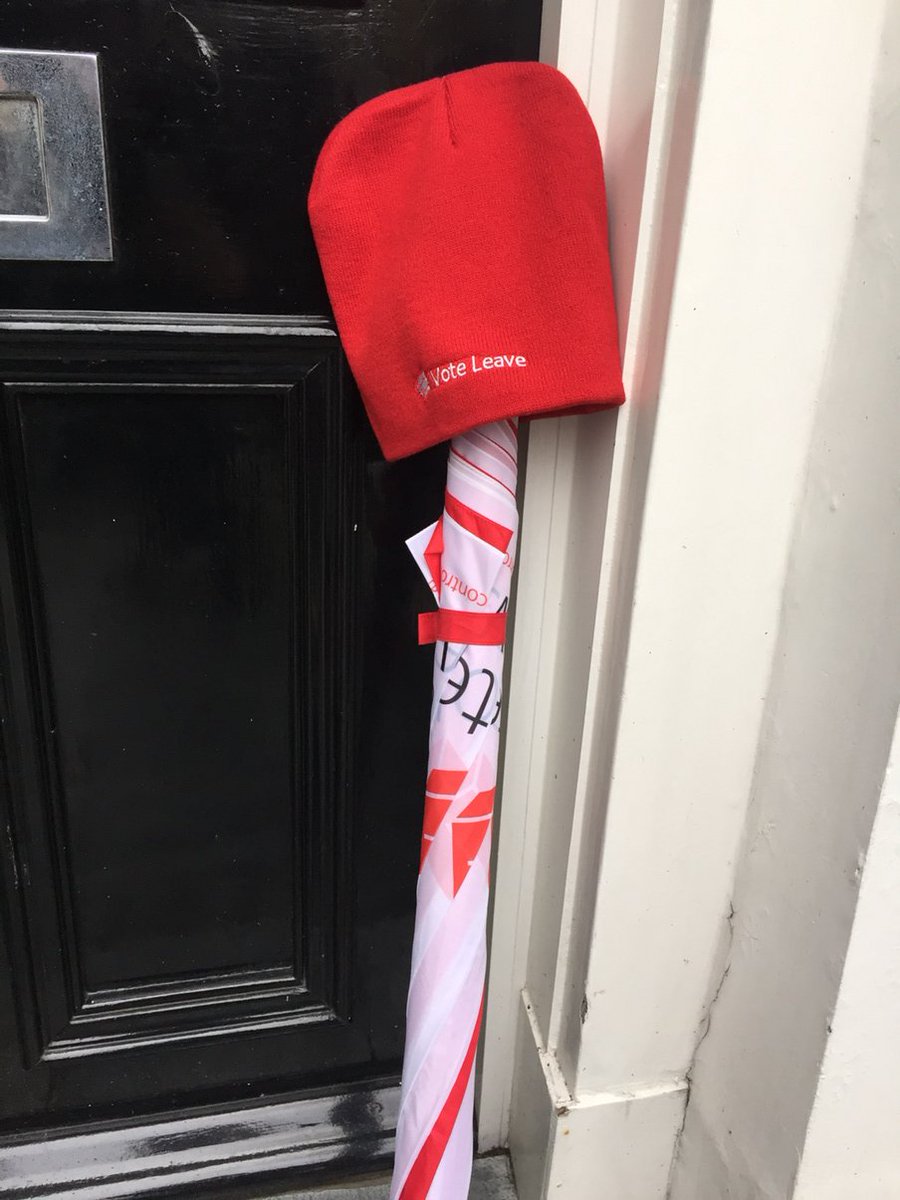 The ‘Vote Leave’ campaign was swift to react today, putting its umbrellas outside the Mayor of London’s home.