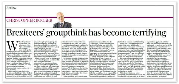 Today, says Booker, all that has gone into reverse. When it comes to group think, this is still evident among some of those who wept in disbelief when last year’s referendum result was announced, but they are now drowned out by the exultant group think of the ultra-Brexiteers.